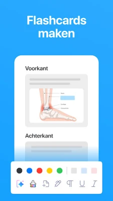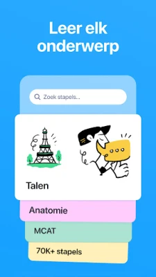 Ontketen uw creativiteit met de krachtige kaartjesmaker van Cogni Flashcards, waarmee u uw eigen studiemateriaal kunt ontwerpen met afbeeldingen, opsommingstekens en levendige kleuren die perfect aansluiten bij uw unieke leerstijl. Geen zin om alles zelf te maken? Duik direct in een schat aan meer dan 50.000 reeds samengestelde decks, variërend van anatomie en farmacologie tot uitgebreide voorbereidingen voor SAT- en MCAT-examens. Bovendien biedt de vloeiende interface een moeiteloze organisatie van duizenden studiekaarten, terwijl de offline modus u de vrijheid geeft om overal en altijd te leren, zelfs zonder internetverbinding.
