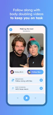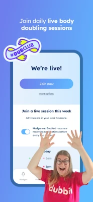 Verhoog uw productiviteit en voel de kracht van verbinding met dubbii's dynamische functies. Neem deel aan dagelijkse live body-doubling sessies, waar u samen met een gemotiveerde gemeenschap een 'power-hour' aanpakt en elkaar inspireert. Voor momenten dat u liever op uw eigen tempo werkt, bieden de gestructureerde videobegeleidingen van Rich en Rox van ADHD Love de uitkomst. Zij ontleden talloze alledaagse klusjes in microstappen, zodat overweldiging plaatsmaakt voor gerichte actie. Van het opruimen van uw slaapkamer tot het afhandelen van administratie, nieuwe taken worden continu toegevoegd om u te blijven ondersteunen.