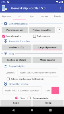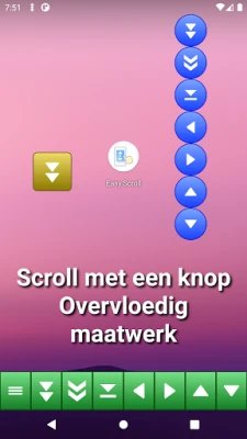 Gemakkelijk scrollen is een veelzijdig hulpmiddel voor moeiteloos navigeren. Scroll door te tikken, vegen, met volumetoetsen of schudden. Stel de scrollsnelheid en knoppen naar wens in. Ideaal voor het lezen van e-books en het personaliseren van uw scrollervaring.