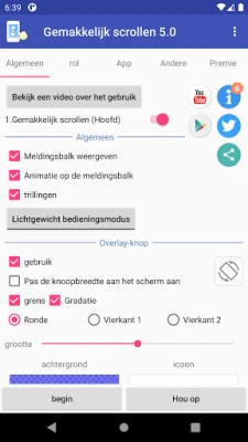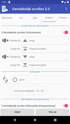 De kracht van deze oplossing ligt in zijn veelzijdige bedieningsopties. Schakel met een simpele tik op een aanpasbare knop, gebruik uw volumetoetsen voor een discrete scrollervaring, of activeer de functie zelfs door uw apparaat te schudden – alles naar uw voorkeur in te stellen. Pas de scrollsnelheid nauwkeurig aan, van een kalme doorloop tot een snelle blik, en personaliseer de scrollknoppen volledig qua kleur, oriëntatie en aantal. Dit maakt het niet alleen ideaal voor algemeen gebruik, maar ook perfect voor diegenen die lange e-books lezen, dankzij de geïntegreerde optie voor het gemakkelijk omslaan van pagina's.