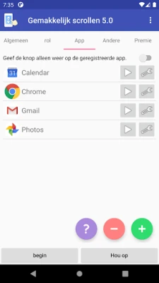 Geniet van een naadloze ervaring doordat u kunt instellen welke applicaties standaard profiteren van deze handige scrollfunctionaliteit. Zodra u een geregistreerde app opent, worden de slimme scrollhulpfuncties automatisch geactiveerd, waardoor uw workflows nog efficiënter worden. Om deze geavanceerde ondersteuning te kunnen bieden, maakt de app gebruik van specifieke systeemservices die het mogelijk maken om gebaren te assisteren en instellingen aan te passen wanneer u van app wisselt. Wees gerust, via deze services worden er absoluut geen persoonlijke gegevens verzameld of gedeeld, en de functionaliteit voor het registreren van uw favoriete apps dient enkel en alleen om uw gebruiksgemak te maximaliseren.