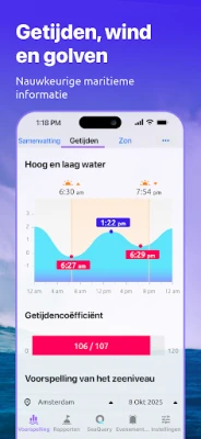 Krijg nauwkeurig inzicht in getijdenbewegingen met dagelijkse en maandelijkse tabellen, inclusief voorspellingen voor hoog- en laagwater en getijhoogtes. De windsectie biedt cruciale details over snelheid, windstoten en kracht, zowel op land als op zee, onmisbaar voor elke watersport. Voor surfers zijn er gedetailleerde analyses van deininghoogte, -richting en golfperiode beschikbaar om de perfecte golf te vinden. Vissers profiteren van een unieke uurlijkse activiteitenkaart en solunaire perioden, die de beste vismomenten van elke dag markeren, aangevuld met maandelijkse overzichten van visactiviteit.