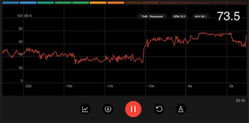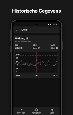 Geluidsmeter onderscheidt zich door een reeks doordachte functionaliteiten die uw gebruikerservaring optimaliseren. Volg het geluidsprofiel van uw omgeving met een dynamische real-time grafiek die fluctuaties duidelijk weergeeft. Krijg essentiële data in één oogopslag met weergaven van de minimale, maximale en gemiddelde decibelwaarden, aangevuld met de duur van elke meting. Of u nu overdag of 's nachts meet, de app past zich aan met een handige dag- en nachtmodus voor optimaal kijkcomfort. De intuïtieve en gestroomlijnde gebruikersinterface zorgt ervoor dat het meten van geluid moeiteloos en plezierig blijft. Bovendien kunt u met de ingebouwde meetgeschiedenis eerdere analyses eenvoudig terugkijken en vergelijken.